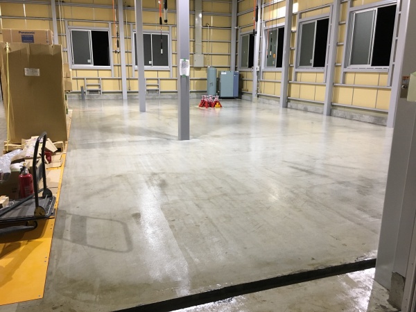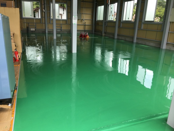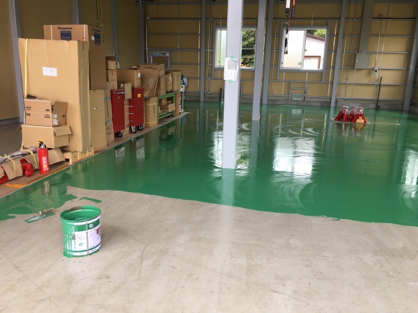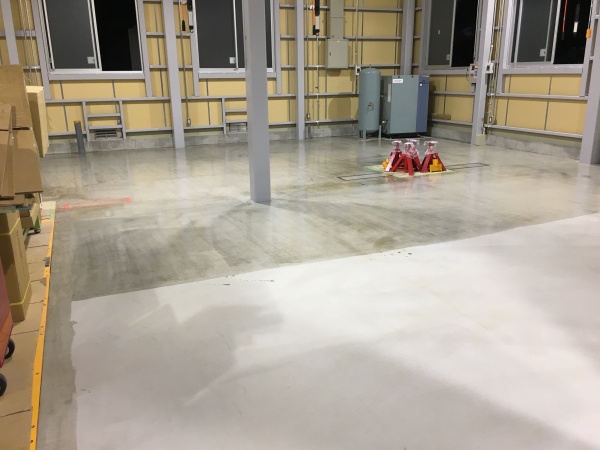 大型トラックの整備場の為、硬質ウレタン床で通常のエポキシ床のはじきをを解消です‼︎