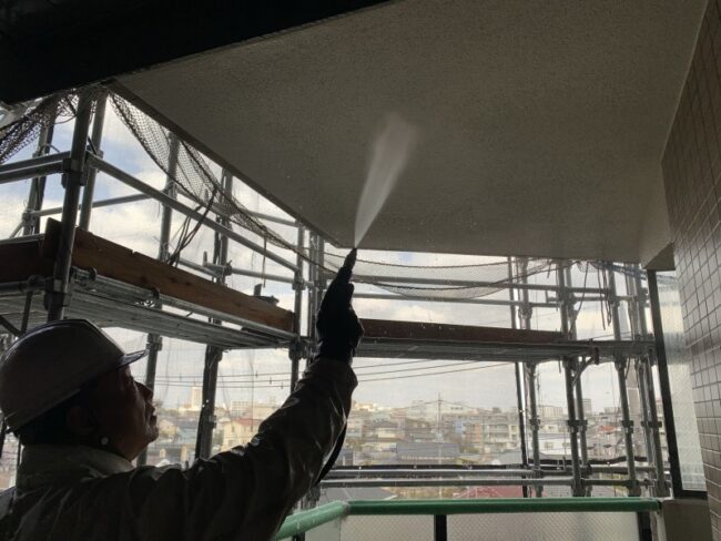 この度、マンション一棟丸ごと打ち放し塗装施行中でございます。