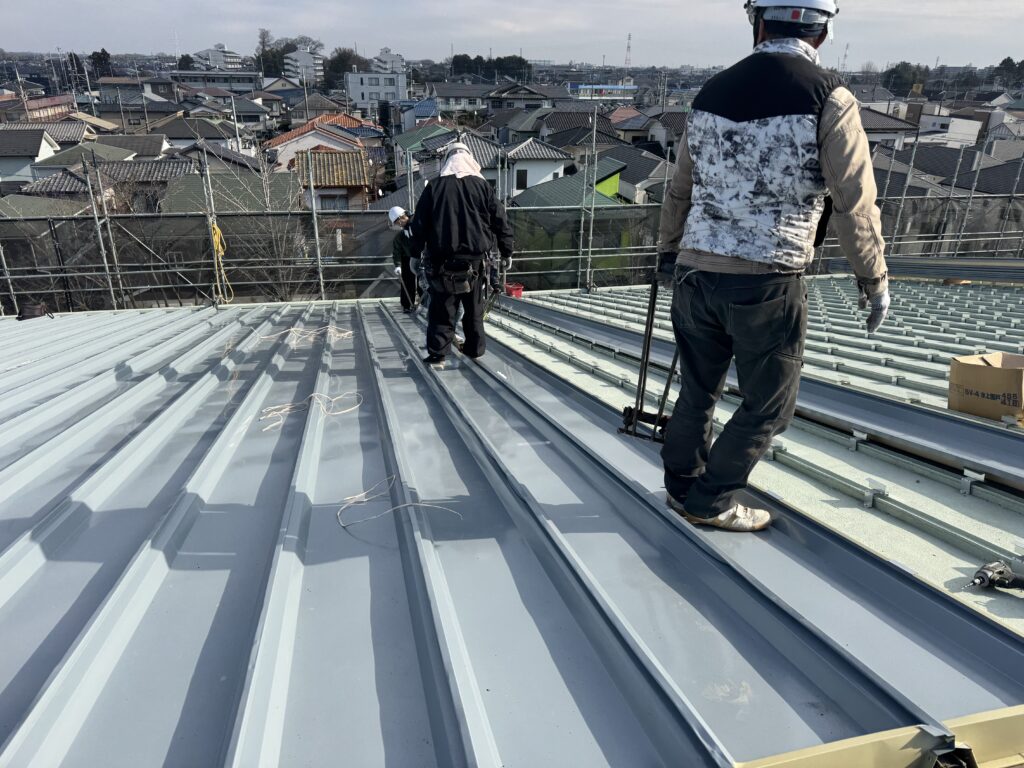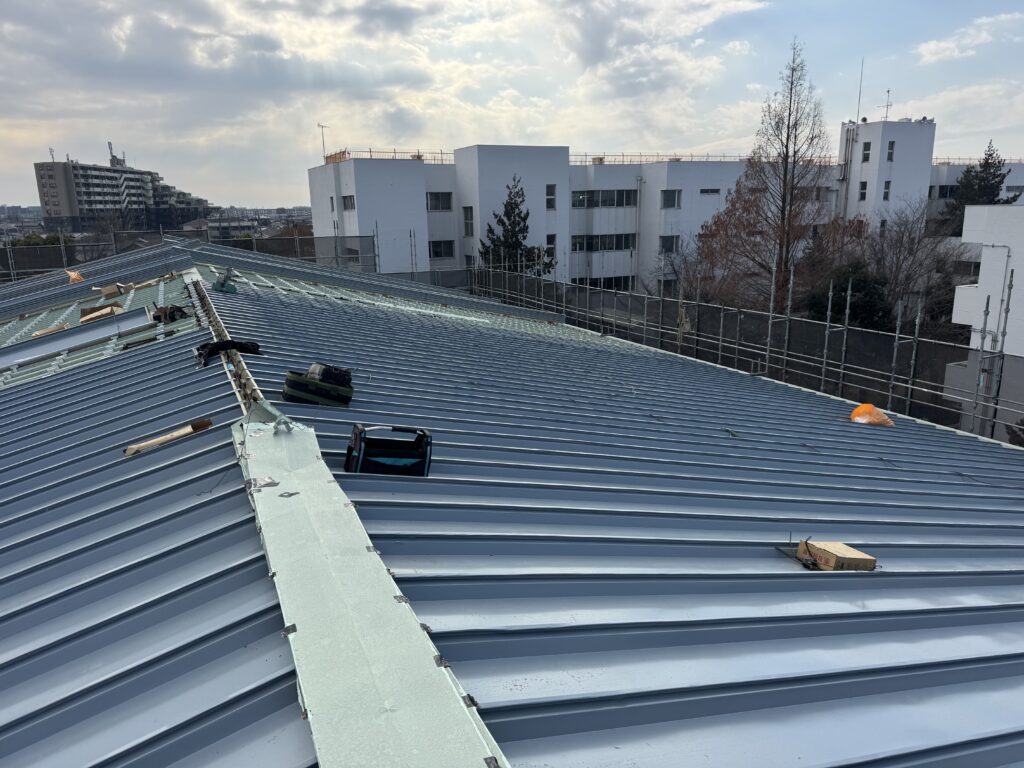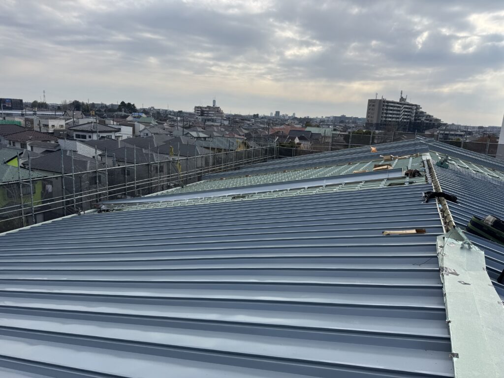 春日部市発注の体育館の屋根全面のカバー工法施行中です。