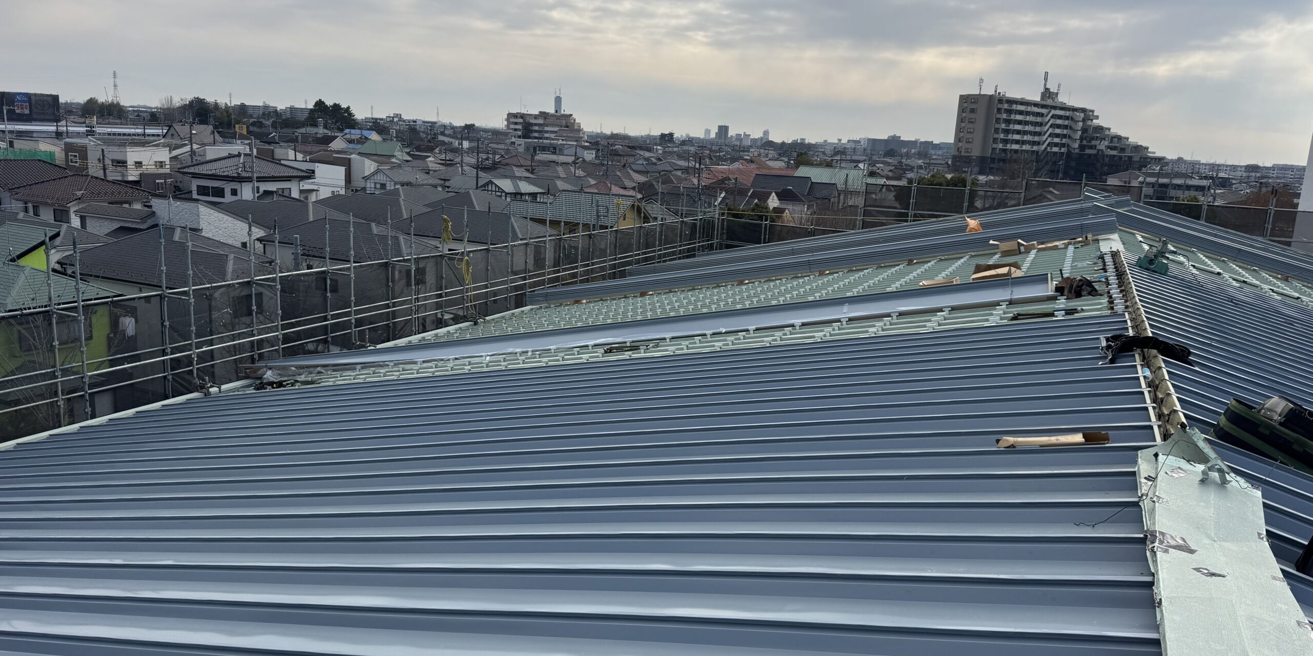 春日部市発注の体育館の屋根全面のカバー工法施行中です。