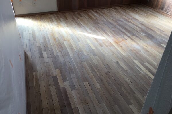 無垢のフローリングを自動カンナとオービタルサンダーで削り出してます。 クリアーを吹いて研いでを何度も繰り返して仕上げて行きます! 元の綺麗さを取り戻しました!