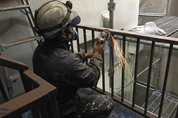 新宿区のマンションの鉄部のケレンの状況です。 塗装が無くなり鉄もピカピカになっちゃった!流石! 一生懸命に吉田技工 若手のホープ SJ郎君が作業しております! 半端に手や皮すき(鉄のヘラ)などで施工せず、 悪い塗膜は全て…