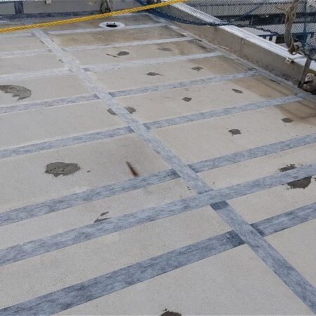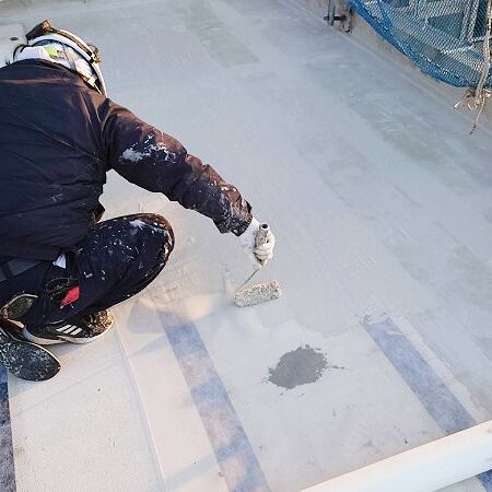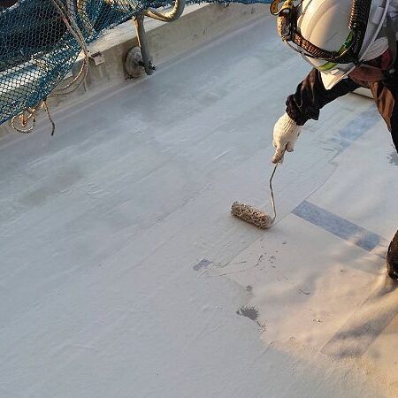 防水工事は種類が数種類あるんです。大きく分ければ、ウレタン防水、アスファルト防水。アスファルト防水の中も熱工法と冷工法と2種類ですね。それと塩ビ防水ですね。一般的に住宅などで、よくベランダ施工が強化プラスチックのFRP防水っていう防水ですね。