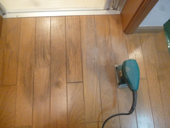 浴室前のところが長年の湿気等でクリアーが剥がれ、全体的に黒ずんでいました こんな感じできれいに修復!! こんなのもお気軽にお問い合わせください。