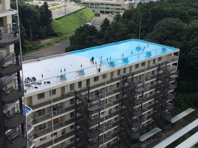 突然4年前のウレタン防水の写真がFBに上がってきたのでアップしてみました‼️これだけ大きくなると手作業で攪拌出来ないので専用トラックでまぜまぜして塗布して行きます。実はこの上にまた屋上があってこれの倍くらいあります。果て…