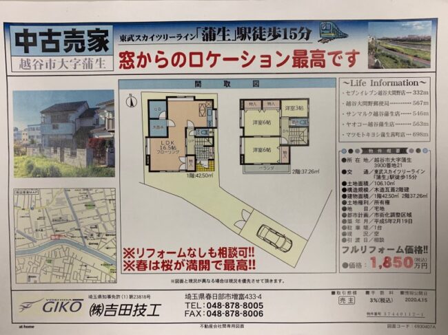 只今 越谷市蒲生にて好評販売中の物件のご紹介です。 吉田技工 不動産部よりご紹介させて頂きます。当物件は綾瀬川沿いにあり対岸には堤防沿いに数キロに渡り桜の木がございます。4月になりますと窓からのロケーションは眼を見張るば…