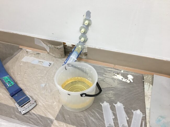 ビルの1階の壁部分のクラックからの漏水です!今回は止水処理の24時間低圧注入工法を採用です! かなりの確率で止水出来ますよ! 漏水でお困りの方どうぞお試しください!^_^