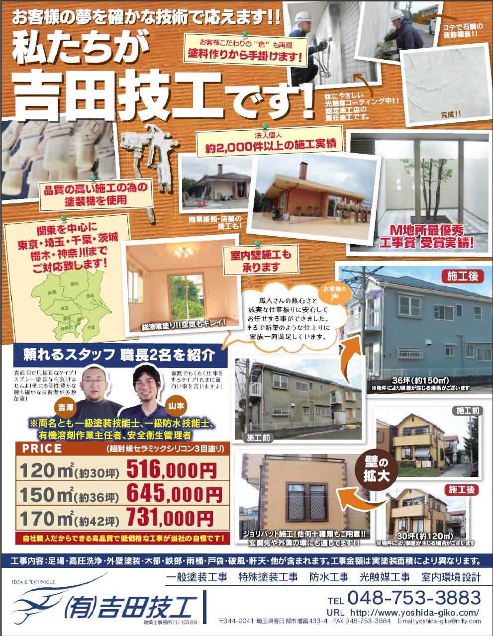 春日部の外壁塗装、塗り替え、防水工事の株式会社吉田技工なら一戸建て外壁塗装、屋根塗装、ジョリパットから1棟ビル施設マンション大規模改修まで