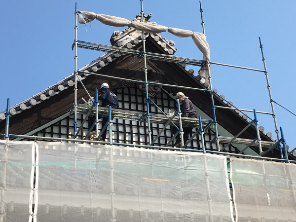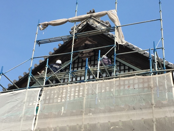 一般住宅でいう破風にあたる部分を塗装しております。この部分は専門用語で懸魚(げぎょ)といいます。頑張って仕上げていきます^_^