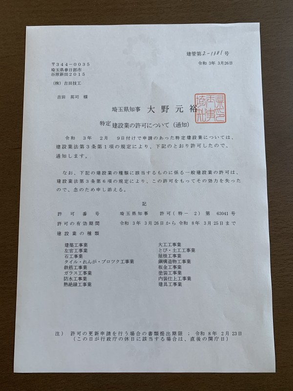4月32021塗装職人ブログ施工事例この度、株式会社 吉田技工は会社として一つステップアップ致しまして 一般建設業から特定建設業に申請し、 許可を頂きました‼️😁😁😁 金額が限られる下請業者から金額の制約のない元請業者として社会貢献出来るという事になります。 業種も16業種とほぼ網羅しております。 今後とも社員一同さらに頑張って参ります。 何卒、宜しくお願い申し上げます😃😃