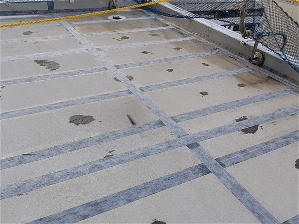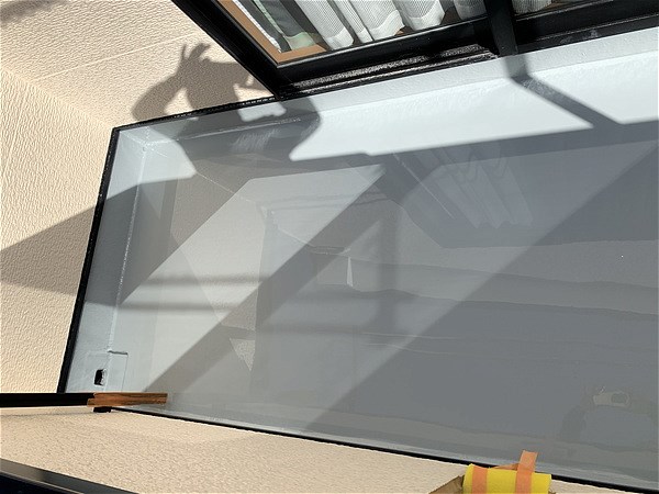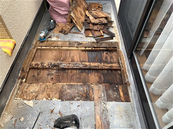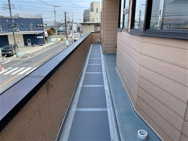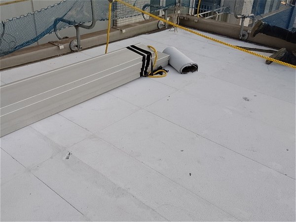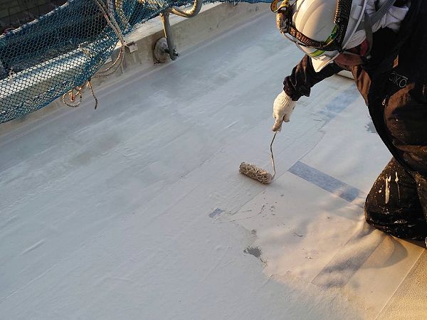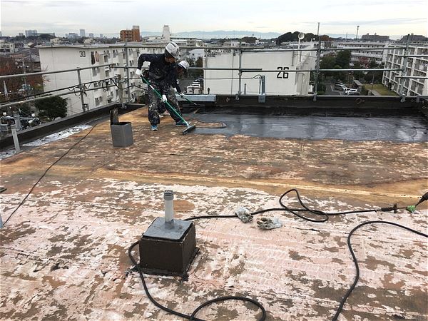 防水工事は種類が数種類あるんです。大きく分ければ、ウレタン防水、アスファルト防水。アスファルト防水の中も熱工法と冷工法と2種類ですね。それと塩ビ防水ですね。一般的に住宅などで、よくベランダ施工が強化プラスチックのFRP防水っていう防水ですね。